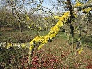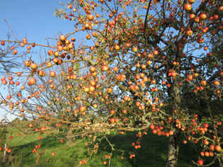 spätherbstlicher Apfelbaum: Die Blätter schon weitgehend verloren,