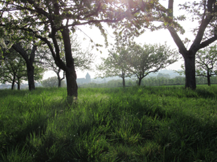 mit der katholischen Kirche im Hintergrund im noch etwas dunstigen Frühjahrsmorgen |